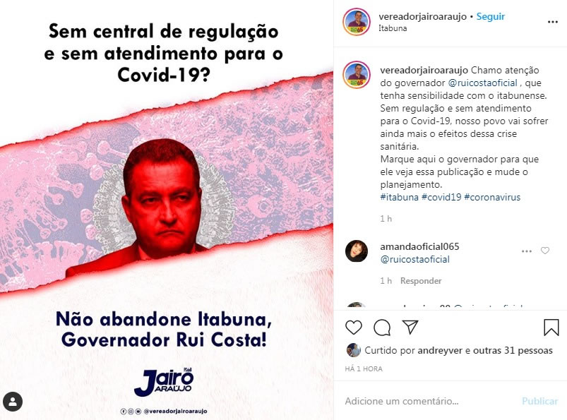“Chamo atenção do governador @ruicostaoficial , que tenha sensibilidade com o itabunense. Sem regulação e sem atendimento para o Covid-19, nosso povo vai sofrer ainda mais o efeitos dessa crise sanitária.” diz a postagem.
