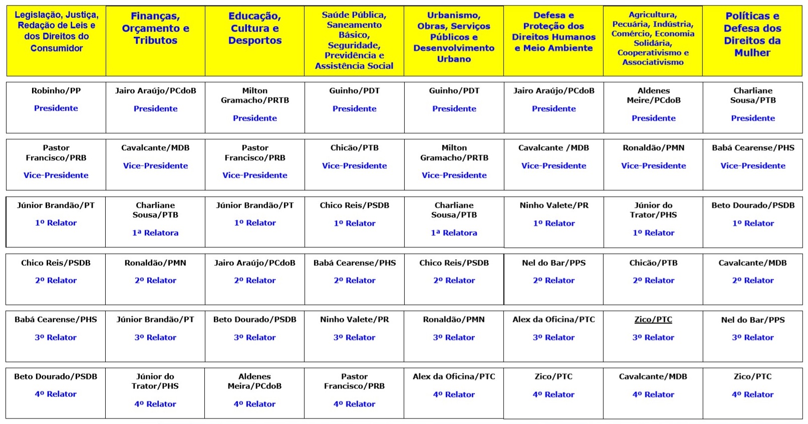 Responsável por analisar, obrigatoriamente, o mérito de todas as proposições, a Comissão de Legislação será presidida por Robinho (PP) e terá Júnior Brandão (PT) na 1ª relatoria. Já a Comissão de Finanças, que aprecia o aspecto financeiro e orçamentário dos projetos de leis, terá como presidente Jairo Araújo (PCdoB) e como 1ª relatora, Charliane Sousa (PTB).