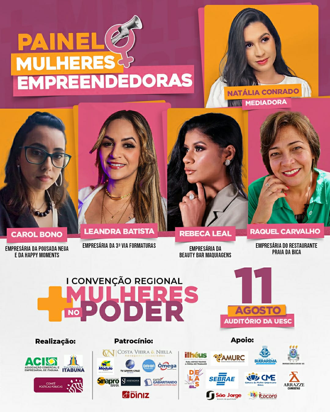 Às 15 horas acontece o Painel 2 com as seguintes painelistas: Monaliza Tavares – Prefeita de Ibicaraí, Enilda Mendonça – Vereadora de Ilhéus, Mariana Alcântara – Presidente Municipal do Partido Cidadania – Itabuna, Maria Alice Pereira – Articulista Política e ex-secretária de Governo da Prefeitura de Itabuna e Lívia Mendes- Secretária de Saúde de Itabuna.