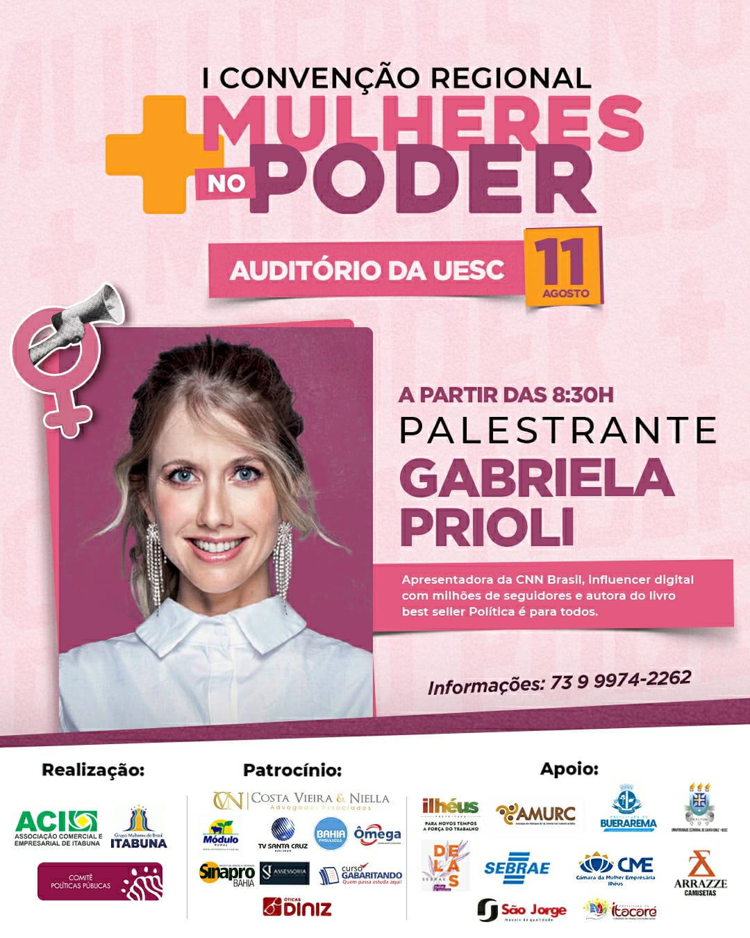 A importância da mulher nos espaços de poder da sociedade será abordada na 1ª Convenção Regional Mais Mulheres no Poder, nesta quinta-feira, 11, a partir das 8h30 no auditório Paulo Souto, da Uesc. O evento, suprapartidário, é realizado pelo Grupo Mulheres do Brasil, por meio do Comitê de Políticas Públicas do Núcleo de Itabuna e vai contar com a presença de painelistas e palestrantes, entre elas, Gabriela Prioli – advogada, professora, comentarista política, apresentadora na CNN Brasil e autora do best seller: Política é para todos.