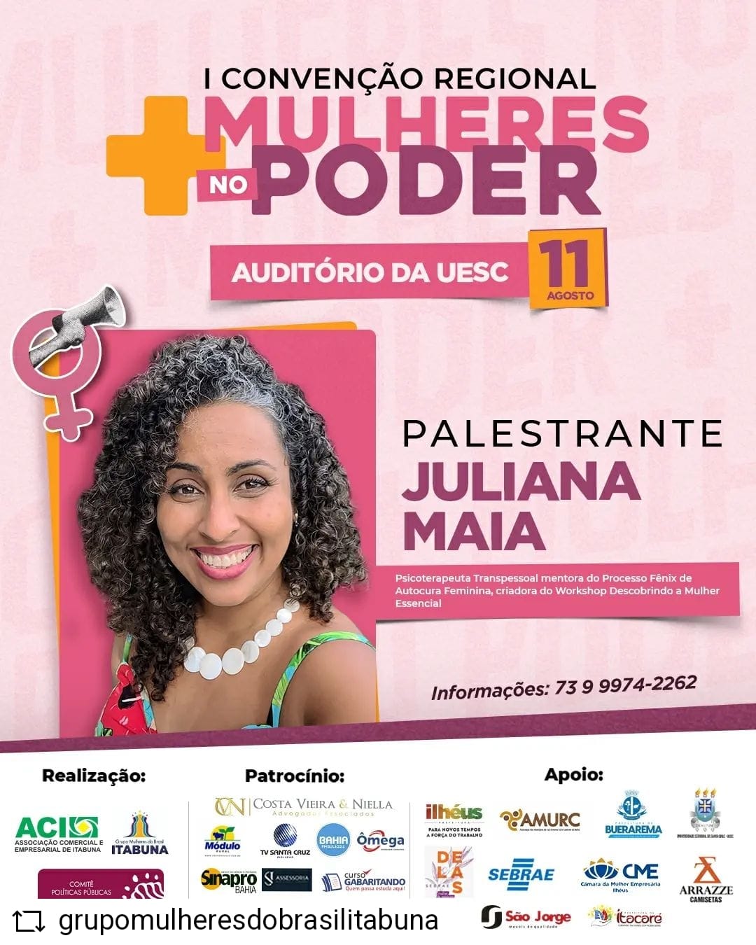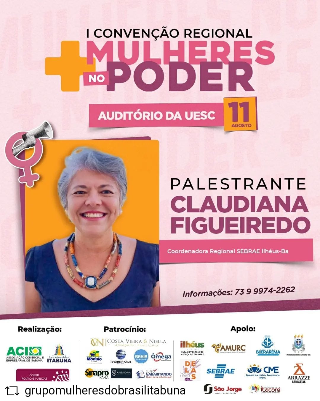 O evento tem a co-realização da Associação Comercial e Empresarial de Itabuna – ACI, o patrocínio de: Costa Vieira & Niella Advogados Associados, Módulo Rural, TV Santa Cruz, Bahia FM Sul, Ômega Contabilidade e Sinapro Bahia, o apoio da Prefeitura de Ilhéus, Amurc, Prefeitura de Buerarema, Uesc, Sebrae Dellas, Sebrae, Câmara da Mulher Empreendedora e Arrazze Camisetas.