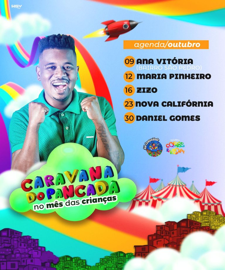O vereador Fabrício Pancadinha (PMN) divulgou ações voltadas em comemoração ao mês das crianças. Os bairros São Pedro, Maria Pinheiro, Zizo, Nova Califórnia e Daniel Gomes irão receber entre os dias 9 e 30 a ‘Caravana do Pancada’.
