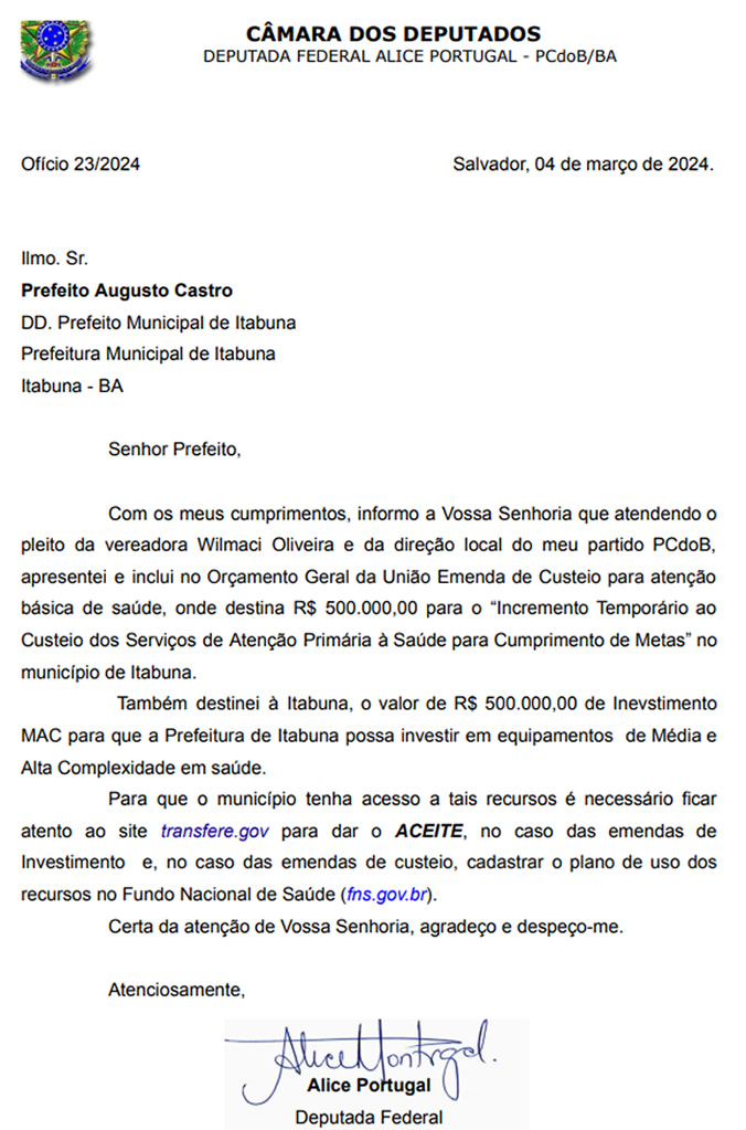 A saúde pública em Itabuna recebeu um importante impulso com a alocação de recursos significativos pela Deputada Alice Portugal. Em resposta aos apelos da vereadora Wilmaci Oliveira, a parlamentar anunciou a destinação de R$ 1 milhão para melhorias na área da saúde do município.